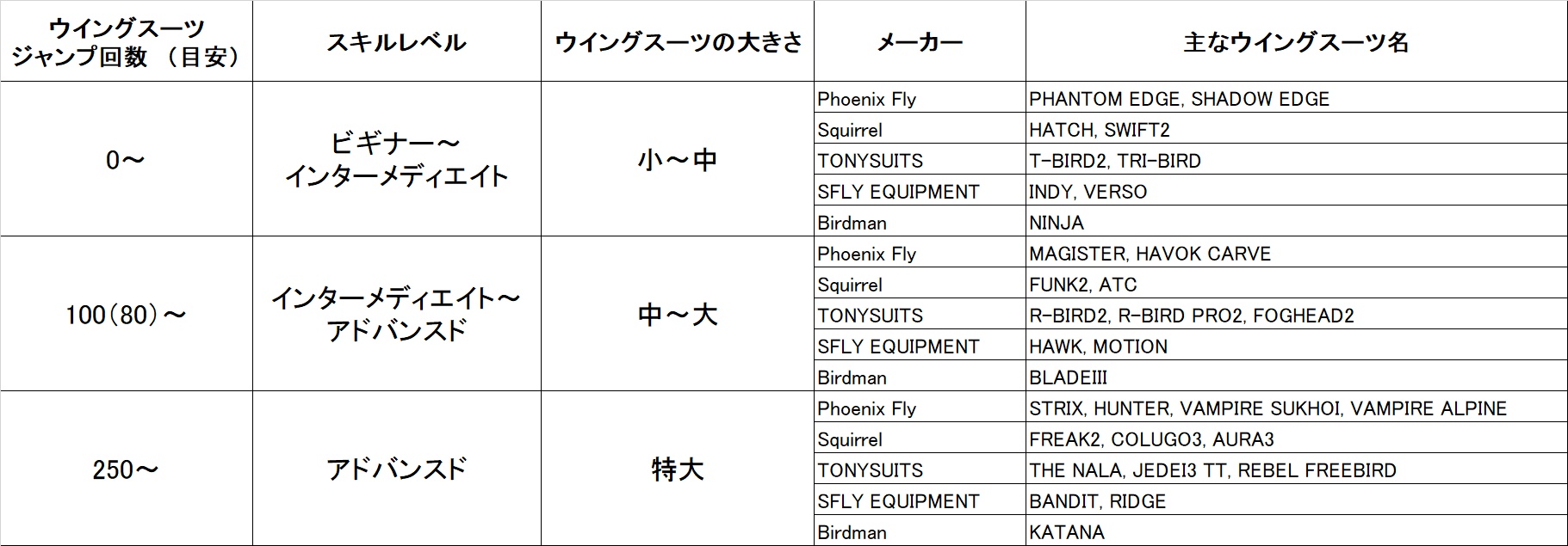 ウイングスーツジャンプ回数に応じたスーツの種類一覧
